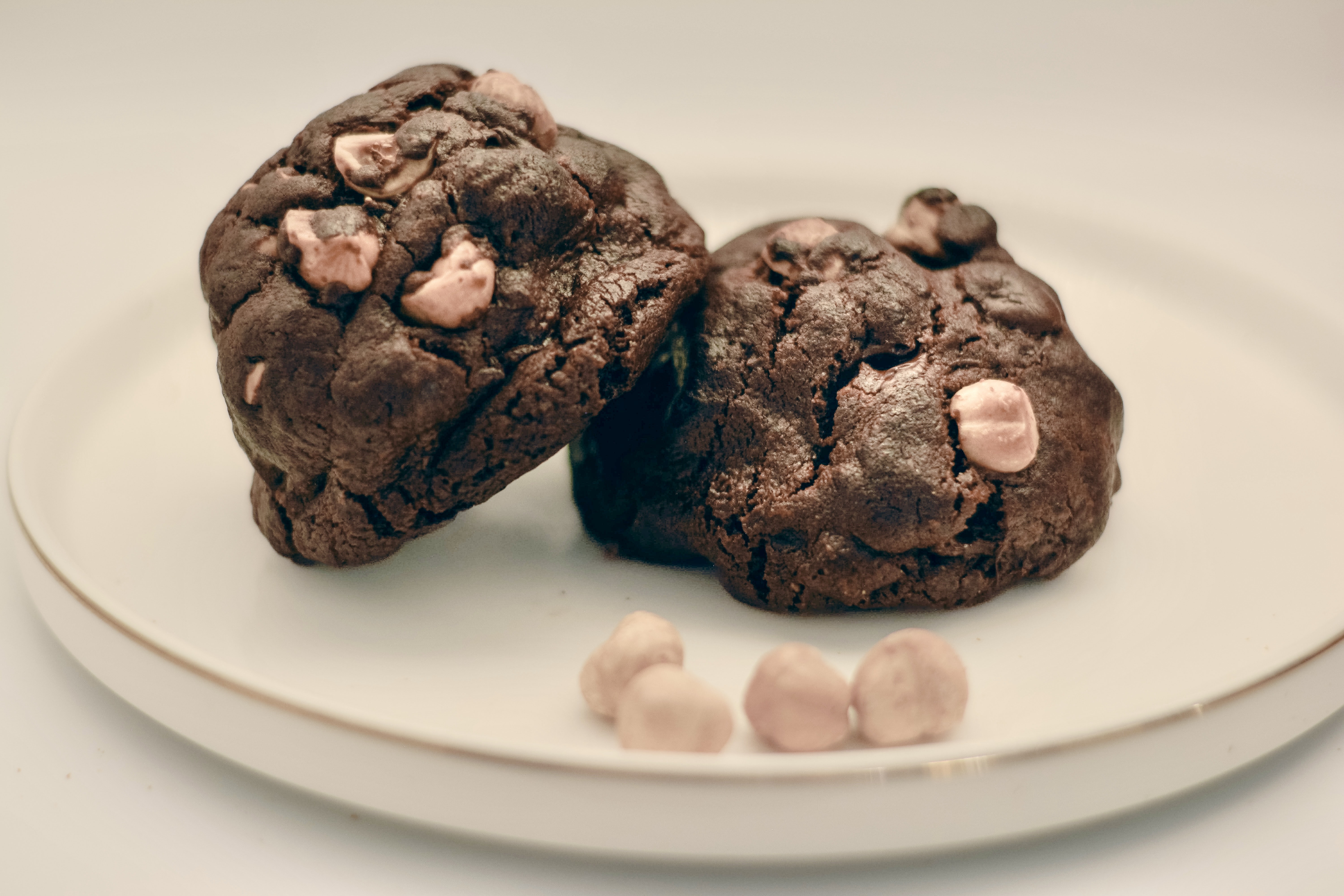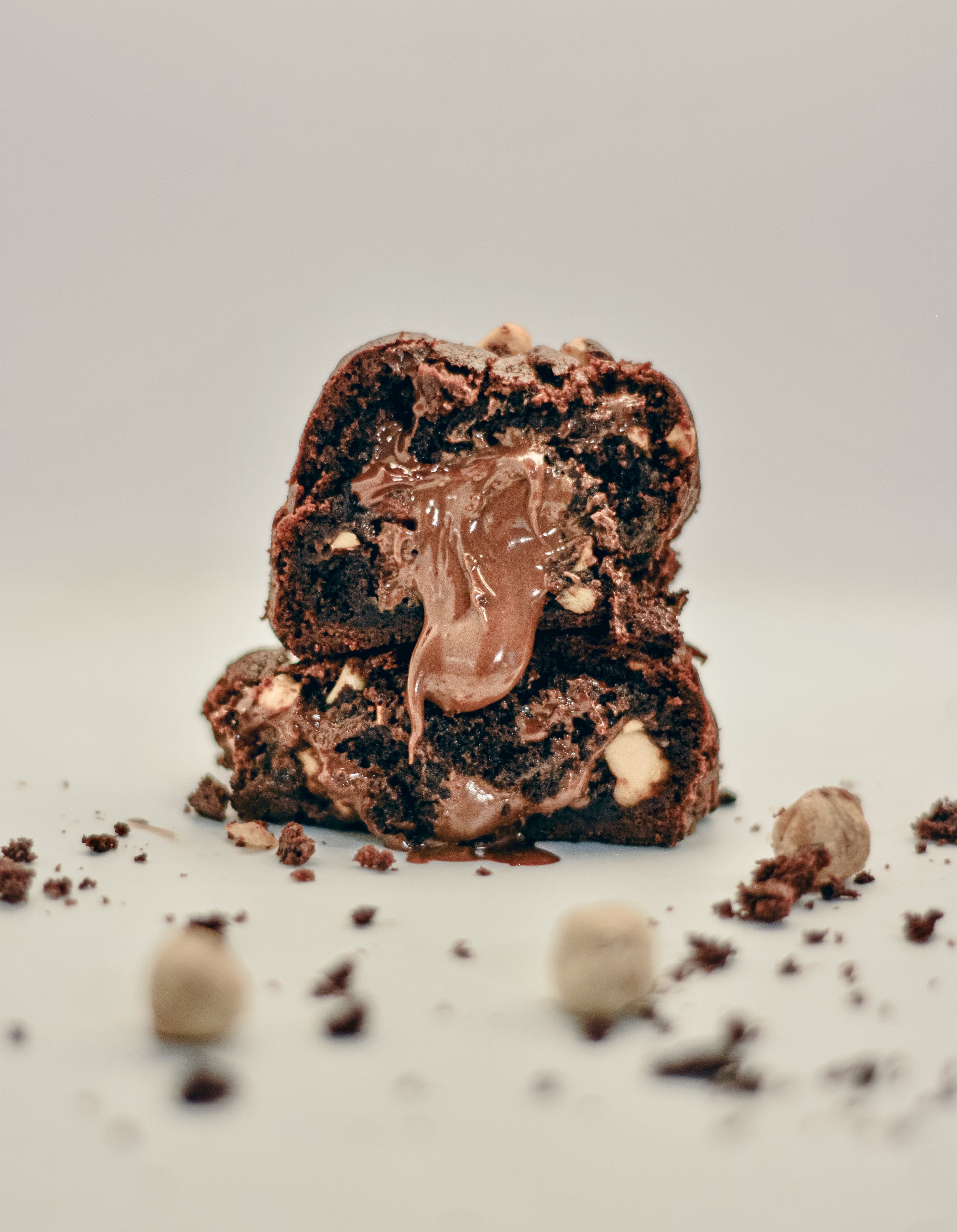 Impasto di cookie al cacao, aggiunto di gocce di cioccolato fondente, nocciole tostate e un inserto di Nutella.