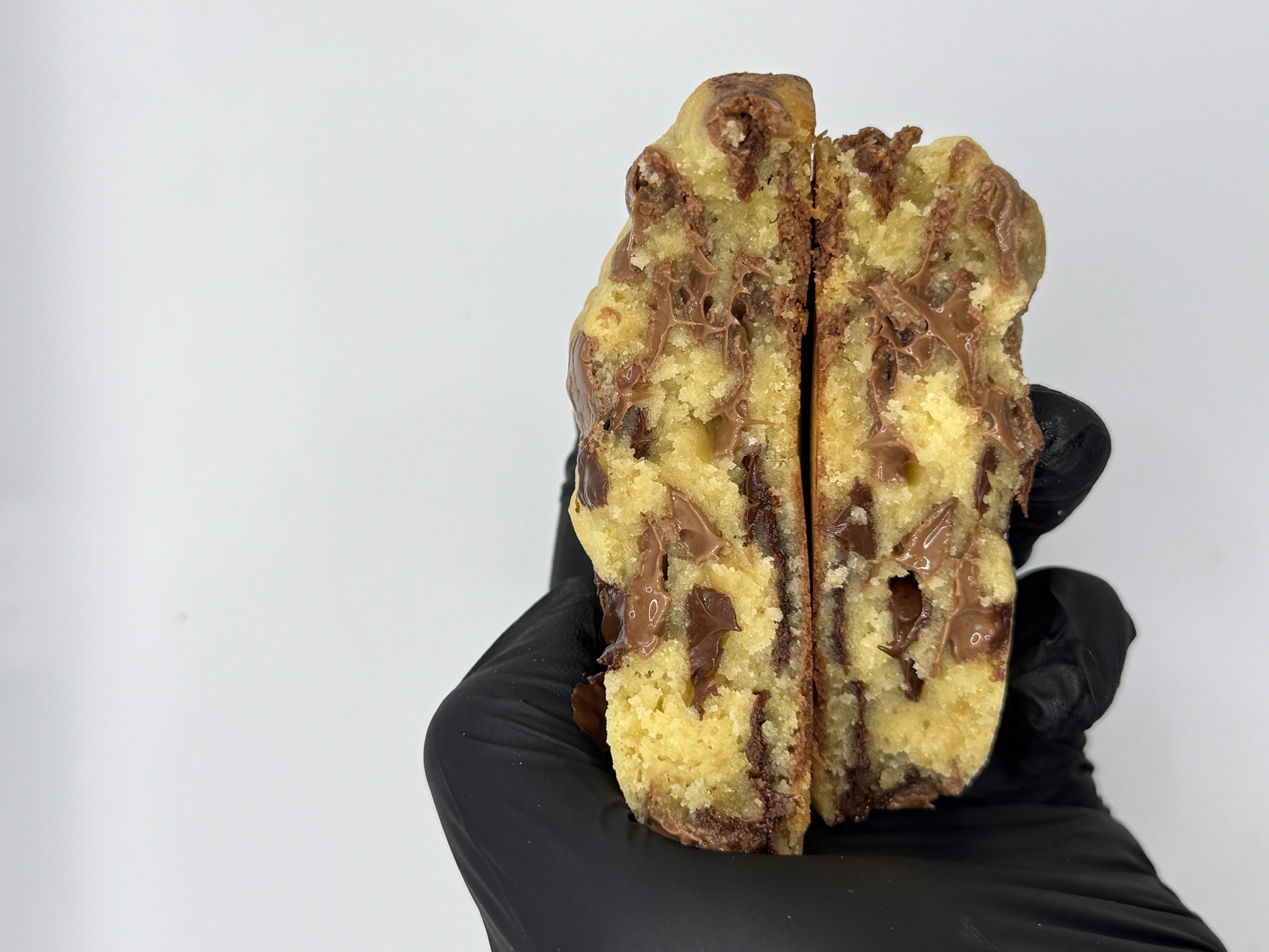Impasto burroso di cookie, aggiunto di gocce di cioccolato bianco, pistacchi tostati e un inserto di ganache al pistacchio.