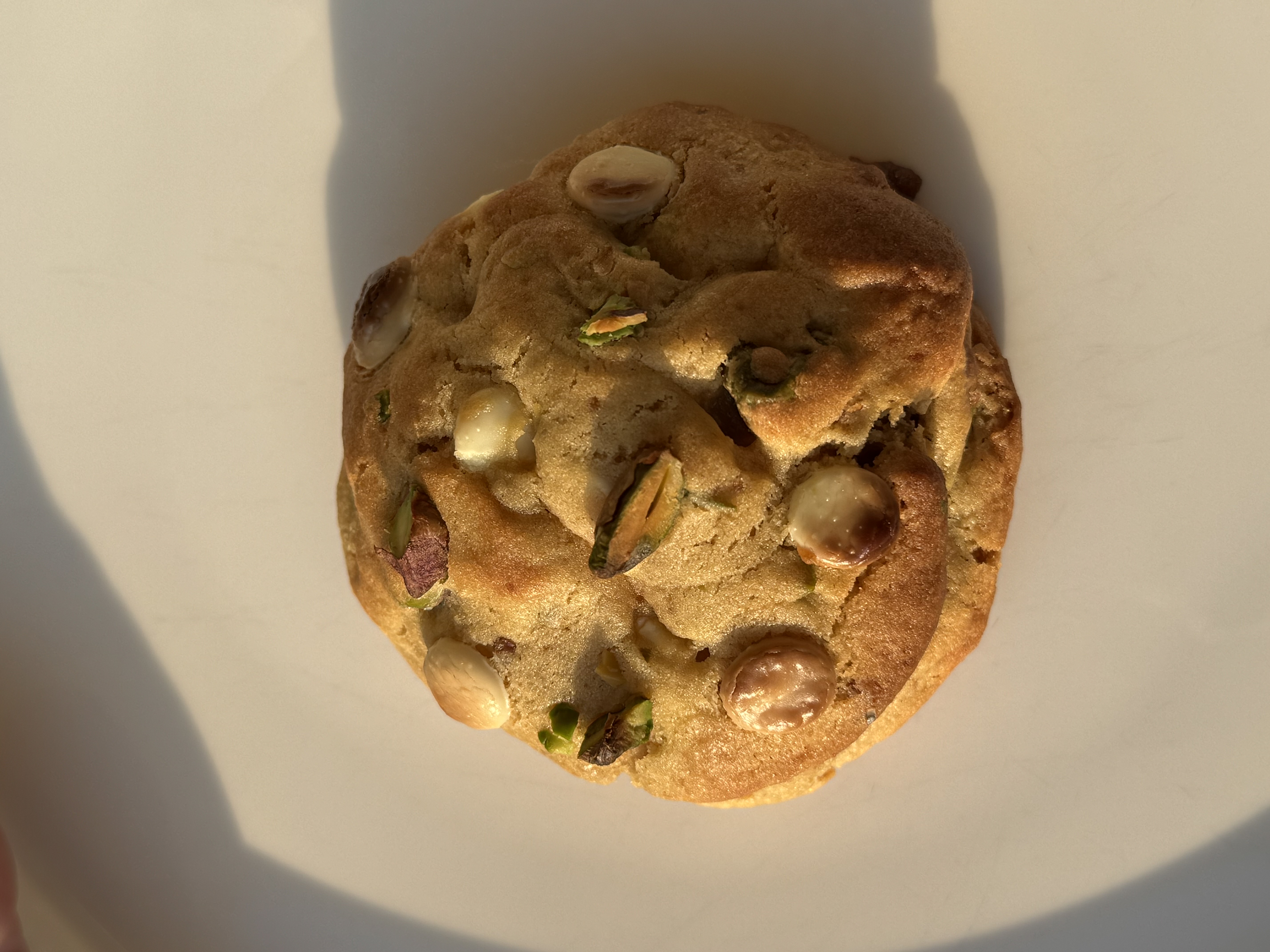 Impasto burroso di cookie, aggiunto di gocce di cioccolato bianco, pistacchi tostati e un inserto di ganache al pistacchio.